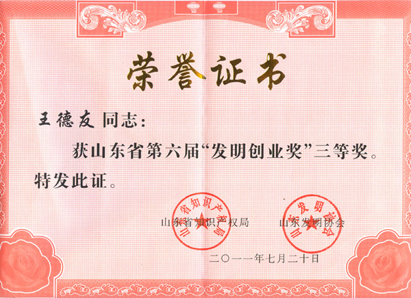 山東省發(fā)明創(chuàng)業(yè)獎(jiǎng)由山東省知識(shí)產(chǎn)權(quán)局、省發(fā)明協(xié)會(huì)聯(lián)合舉辦,針對(duì)全省各行各業(yè)熱愛(ài)發(fā)明創(chuàng)造的發(fā)明人,表彰其積極致力于科技創(chuàng)新、并努力使發(fā)明成果轉(zhuǎn)化應(yīng)用、為推動(dòng)科技進(jìn)步和經(jīng)濟(jì)發(fā)展作出的杰出貢獻(xiàn)而設(shè)立的。本屆共評(píng)選出一等獎(jiǎng)10名、二等獎(jiǎng)20名、三等獎(jiǎng)60名、優(yōu)秀獎(jiǎng)61名。我集團(tuán)王總列53位,獲三等獎(jiǎng)。