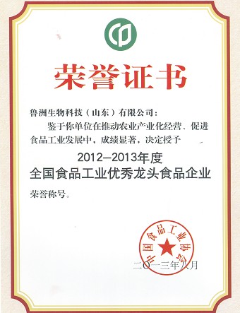 近日,中國食品工業(yè)協(xié)會召開表彰2012——2013年度全國食品工業(yè)強(qiáng)縣(市、區(qū))和優(yōu)秀龍頭食品企業(yè)大會,魯洲生物科技(山東)有限公司,被授予“全國食品工業(yè)優(yōu)秀龍頭食品企業(yè)”榮譽(yù)稱號。