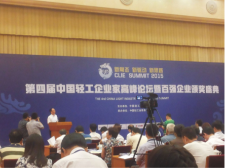 612日,由中國輕工業(yè)聯(lián)合會主辦的“第四屆中國輕工企業(yè)家高峰論壇暨輕工百強(qiáng)企業(yè)頒獎盛典”在北京京西賓館舉行。本屆論壇以“新思路、新驅(qū)動、新常態(tài)”為主題,來自政府部門、協(xié)會、媒體、企業(yè)及各地方輕工業(yè)組織共500余人參加了會議,新浪網(wǎng)等網(wǎng)絡(luò)媒體進(jìn)行了全程報道。