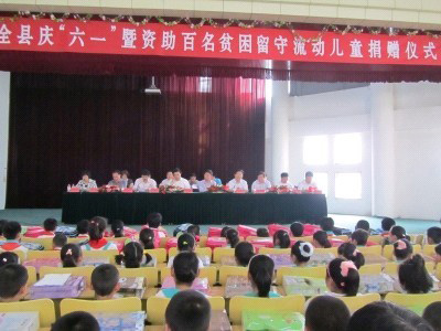 為幫助農(nóng)村貧困留守流動兒童繼續(xù)學(xué)業(yè),努力營造關(guān)愛貧困兒童健康發(fā)展的良好環(huán)境,2011年5月31日,沂水縣婦聯(lián)在第三實驗小學(xué)舉行了全縣慶“六一”暨資助百名貧困留守流動兒童捐贈儀式, 儀式現(xiàn)場向30名留守流動兒童代表各發(fā)放500元資助金、書包及食品。這次活動全縣有170余名貧困留守流動兒童接受愛心人士資助,資助金額達10萬余元。魯洲集團一次就結(jié)對資助了102名貧困留守流動兒童。